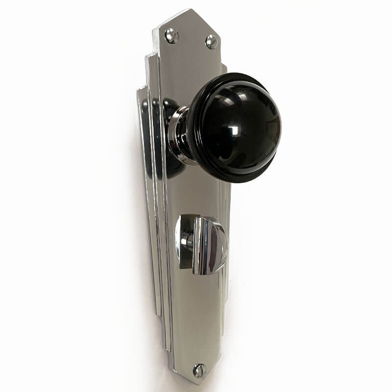 Bakelite Stepped Round Door Knobs Black on Empire Bathroom Plates Chrome