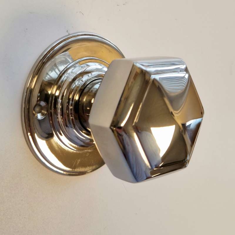Bakelite Hexagonal Door Knobs Polished Nickel on Nickel Rose