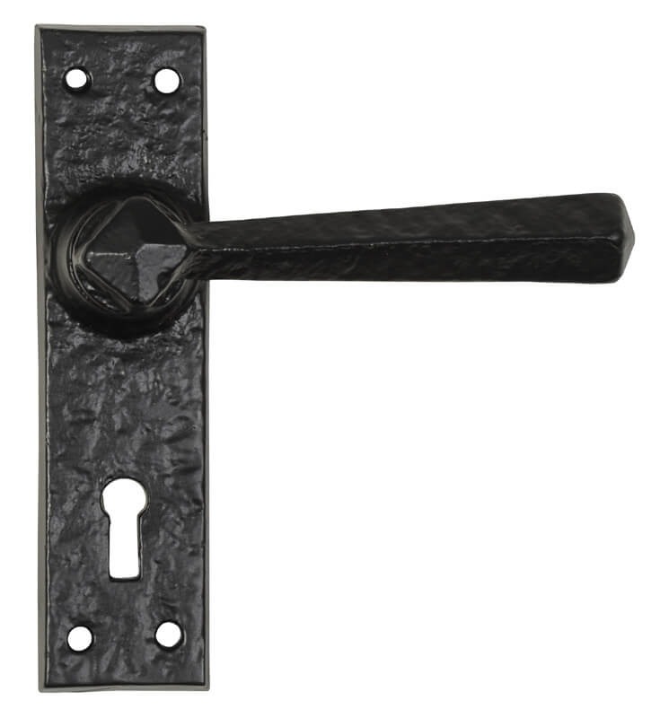 Pair of plain design Antique Black Iron Lever Lock Door Handles. Euro and Oval versions are also available please contact us for more information.
